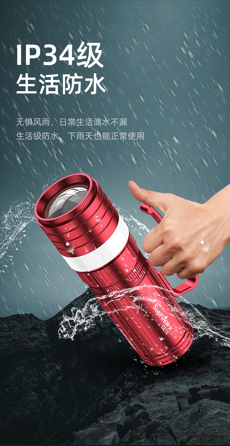 1、圓形光斑,照明效果更佳; 2、伸縮調焦,聚光泛光隨意調焦,適用多種場景; 3、防反接,防過充,低電壓提示等多重安全程序,使用更安全。